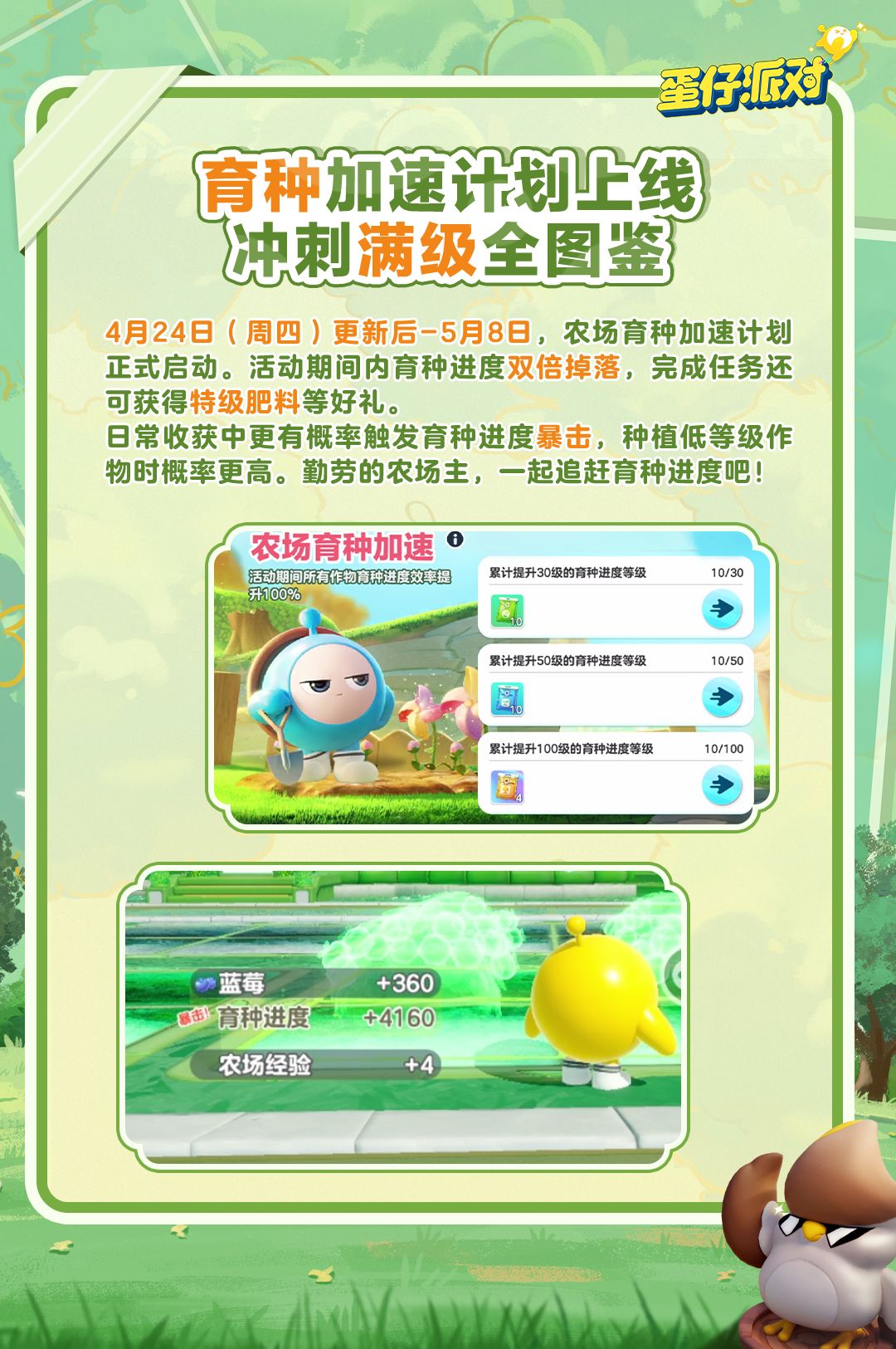 4月24日(周四)更新后-5月8日,农场育种加速计划正式启动。活动期间所有作物的育种进度效率提升100%,完成活跃任务还可获得特级肥料好礼,一起迎接育种进度暴击吧!