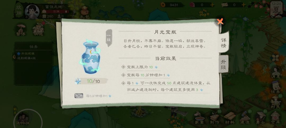 这个在前期是有大用的,他每十分钟会弹下一滴月光水,最多存十滴,月光水能用来缩减建造时间。