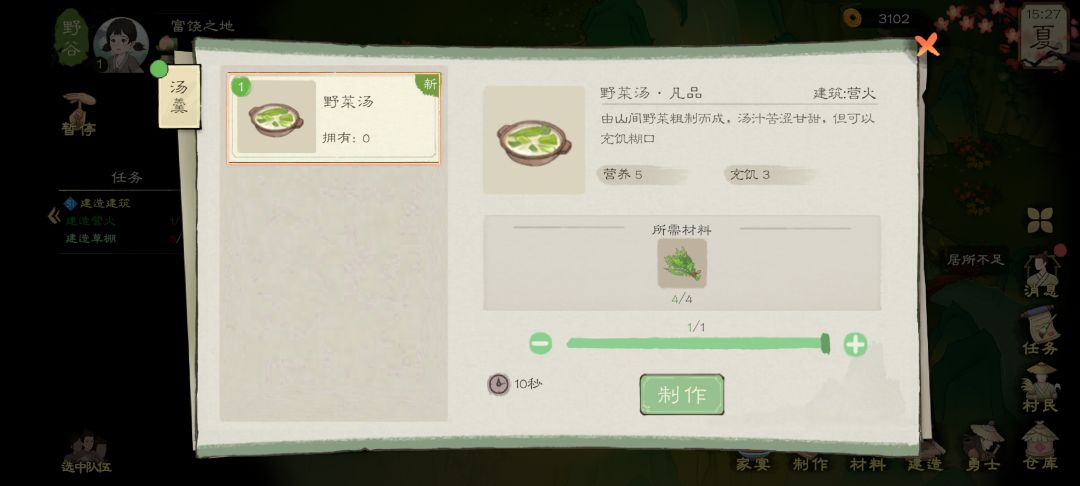 我们这里直接制作野菜面,野菜汤的话,太亏了,要的食物多,加成还少,具体价值大家可以看图,上面的营养与充饥
