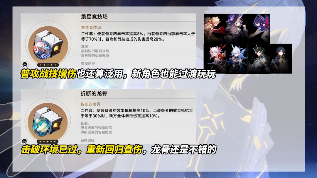 【孽果盘生】①繁星竞技场(属性、生命、攻击),提供普攻与战技增伤,外加基础8%暴击率,可用角色不少,常作为懒得刷新遗器的过渡之选,如万敌、大黑塔都能作为替选;②折断的龙骨(生命、防御、攻击、充能),兜兜转转还是龙骨套香,不想去思考队友是生命C还是攻击C,简单增加暴击伤害就完事了。