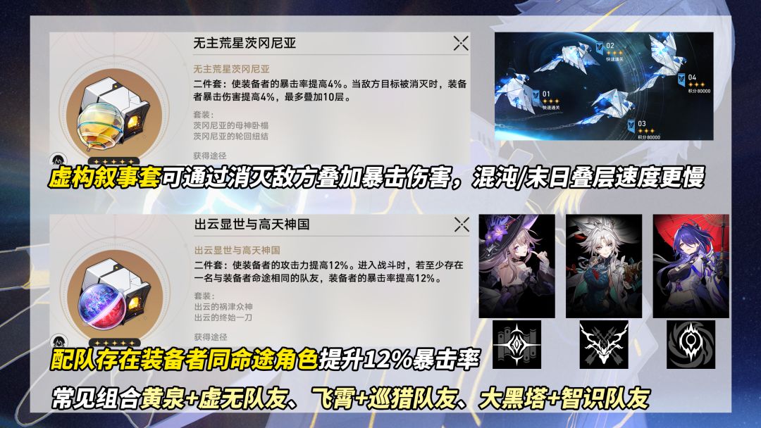 【伴你入眠】①无主荒星茨冈尼亚(副词条有双暴全留),虚构叙事泛用套,消灭敌方叠加暴击伤害,遇到合适词条都可强化玩玩;②出云显世与高天神国(属性、攻击、生命、充能),存在与装备者相同命途队友即可触发12%暴击率(此效果忆灵吃不到),常见组合‘黄泉+虚无队友’、‘飞霄+巡猎队友’、‘大黑塔+智识队友’。