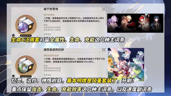 【纷争不休】①谧宁拾骨地(属性、生命、充能),目前生命C最优套装,遐蝶、万敌、缇宝、刃可用。因其属性泛用,未来生命C大概率也可无缝衔接切换;②渊思寂虑的巨树(攻击、生命、充能),这套遗器算是明牌告诉你未来会有记忆命途治疗角色,大概率是后续风堇,准备抽风堇的可以先囤起来。