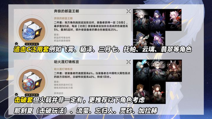 【永恒笑剧】①奔狼的都蓝王朝(属性、攻击、充能),追击C泛用套,适合飞霄、貊泽、三月七、托帕、云璃、翡翠等追加攻击伤害占比大且高频的角色;②劫火莲灯铸炼宫(位面球只要带速度或击破都留、绳子留击破与充能),适合那刻夏(击破玩法)、流萤、忘归人、灵砂、加拉赫考虑,哪怕无火弱也有6%速度。