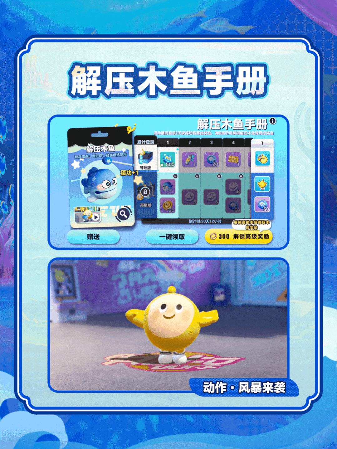 活动期间,花费300蛋币解锁解压木鱼手册高级版即可领取敲好玩的【解压木鱼】玩具啦!解锁高级版手册后登录7天还可领取彩虹币、动作【风暴来袭】等奖励~