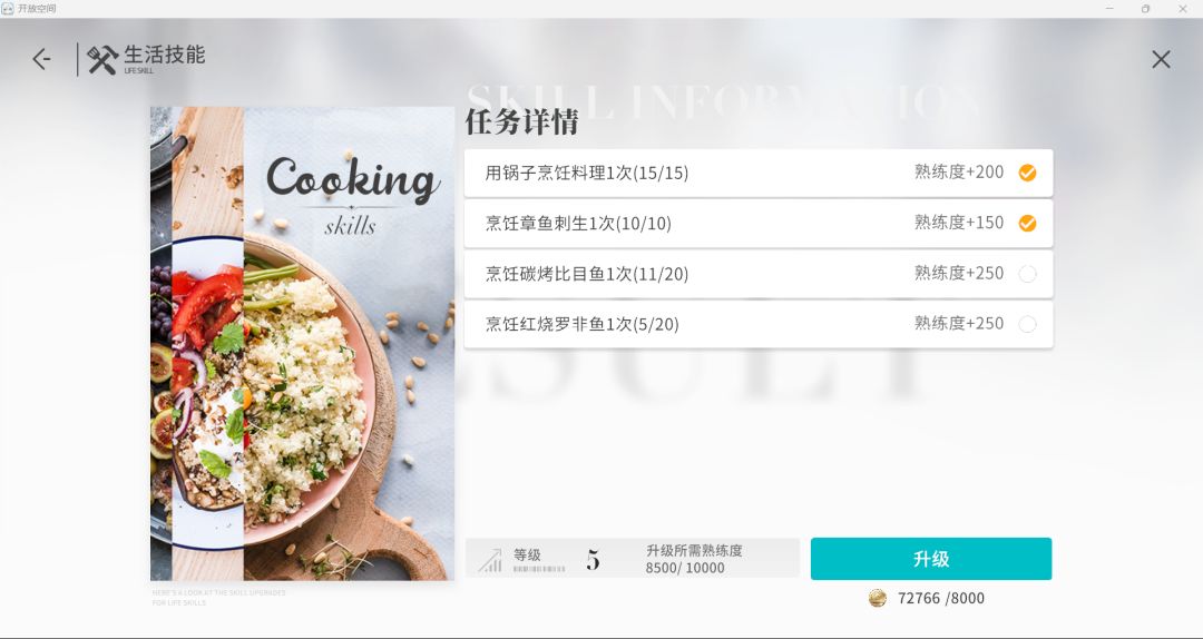此外,由于料理系列任务基本都需要用到鱼,所以钓鱼等级可以和料理等级同步升级,而且料理比其他图鉴制作要简单,把所有的一级食材买上999个,二级食材先做上99个,就能做很多菜了。