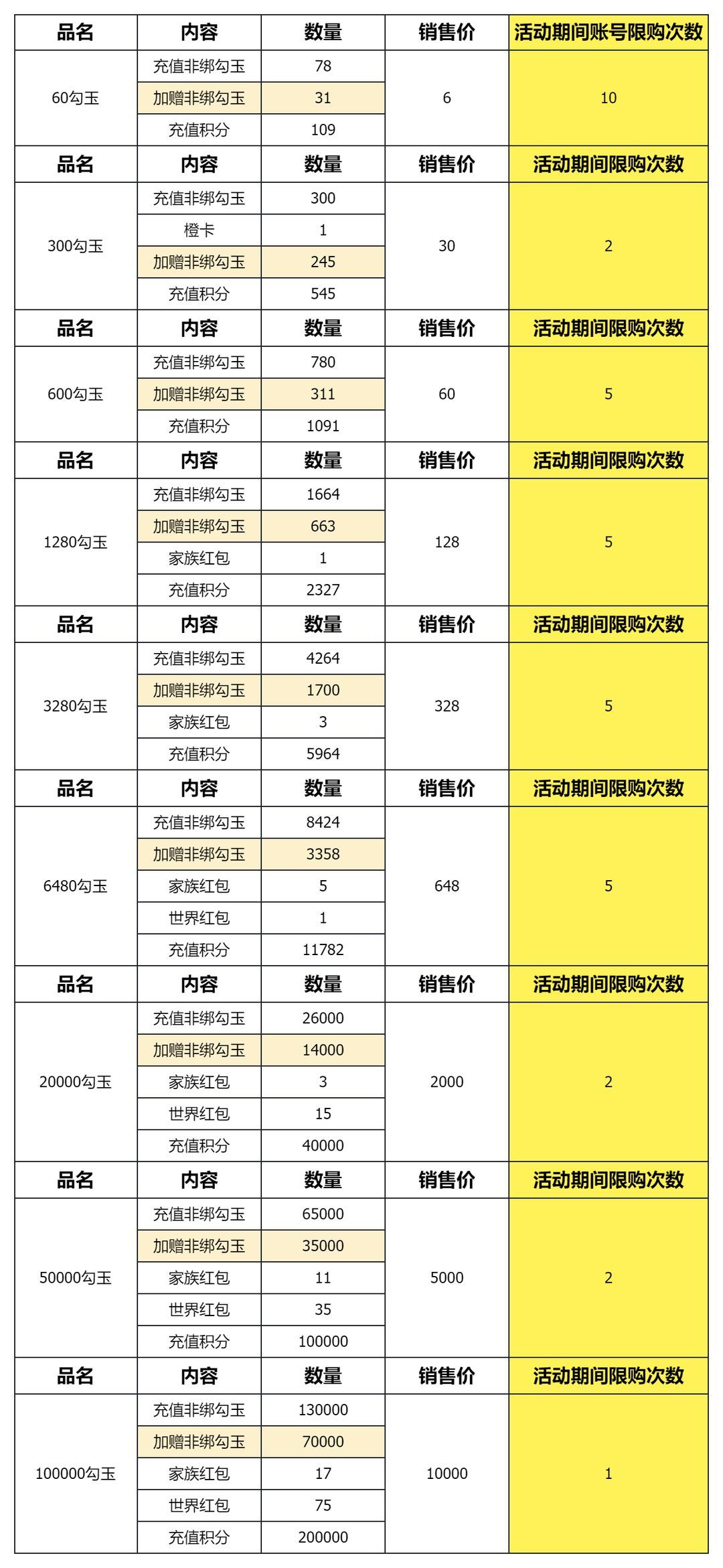 勾玉专区:最后就是我们的勾玉专区啦!本次勾玉售贩主打一个量大管饱!折扣力度不逊于直播售贩哦!甚至比直播时候力度更大啦!列表中显示充值非绑勾玉为常规游戏内充值获得的勾玉总数,加赠非绑勾玉为折扣额外赠送勾玉数量~(如购买60勾玉,实际获得109非绑勾玉+109充值积分),所有勾玉限购为账号层级限购哦,账号下所有角色加一起的限购次数哈~