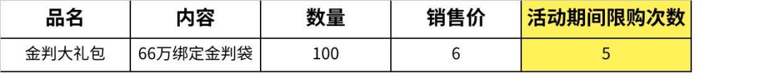 金判礼包冲冲冲:应各位武者大人需求,本次出售金判啦!限购次数5次! 6块钱!6600万金判!一键打开即可使用!