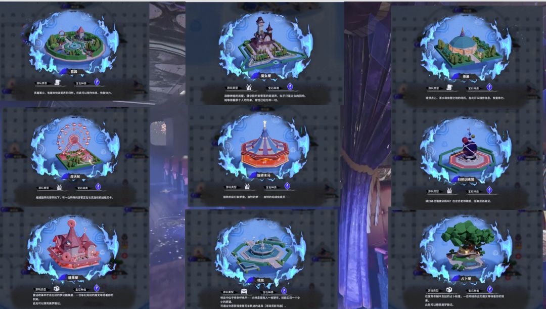 1.黑月游乐城中包含10大固定建筑:糖果屋、占卜屋、喷泉、摩天轮、扫把训练营、旋转木马、花园、茶屋、魔女屋、城堡。在固定建筑中可以体验固定的游玩项目,同时每个建筑必定获得1个随机颜色的宝石(城堡除外)。