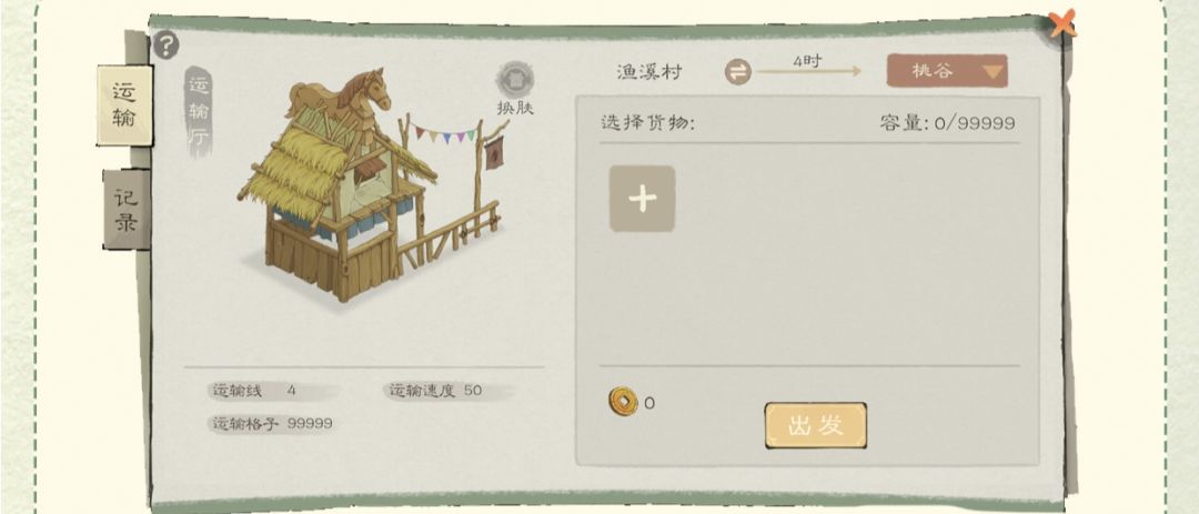 我们可以点击选择货物那个加号,把建筑所需要的货物给放上去,然后运到鱼溪村去