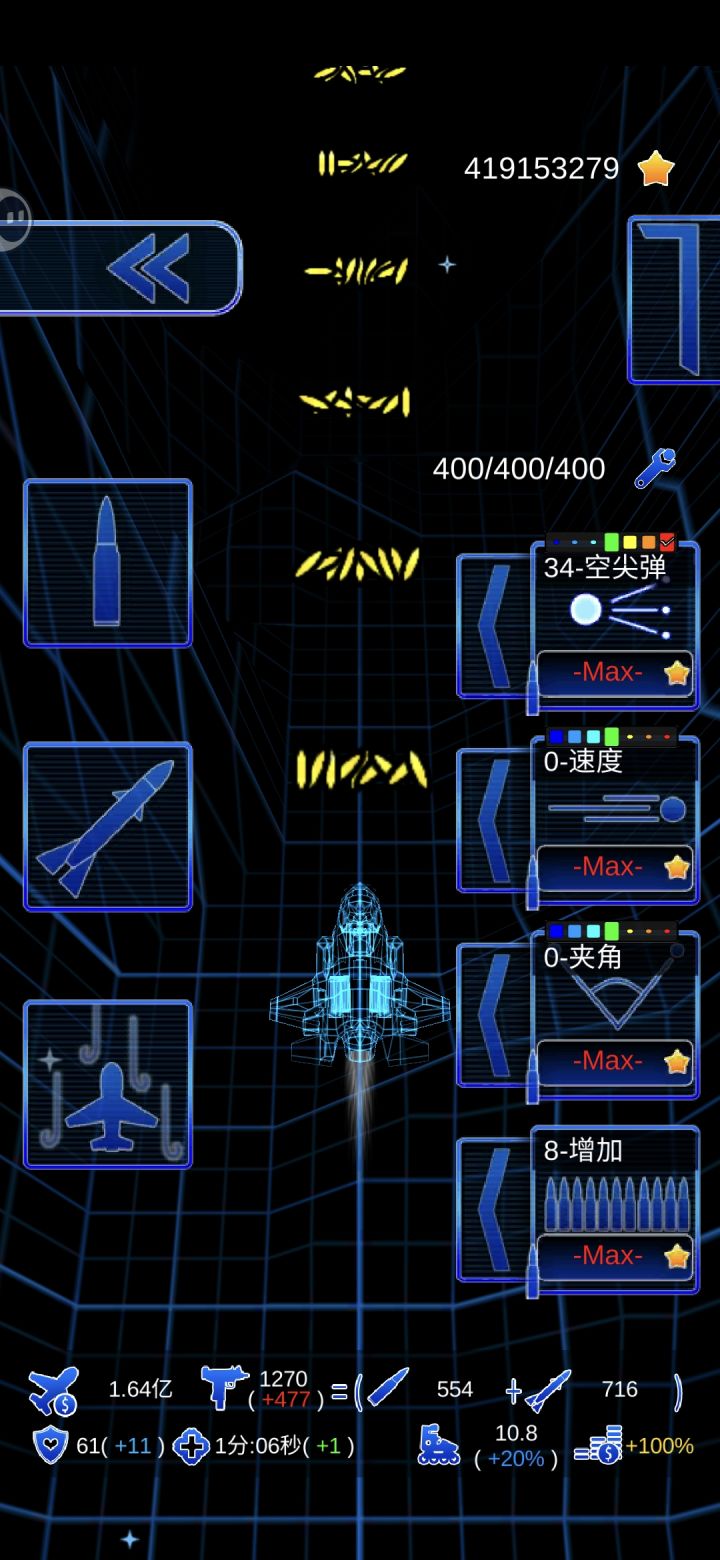 首先,攻击力太高boos等级也会随之变高,boos等级越高弹幕以及爆金币就越多,卡死概率越大。攻击力变高的关键技能点数就是子弹和导弹的数量,刷的技能点加攻击力很少或者不加,子弹的作用是清理精英怪以及打掉坦克的导弹,那玩意儿伤害高,刷的点数全部堆导弹威力,导弹数量不要超过6点,1至3点就足够了,至于金币,不用指望直升机的金币加成,尽可能刷boos,刷到不好用的直接卖掉,买我截图的这架飞机,当然这个玩法比较容易腻就是了,因为没什么参与感,很多小兵还没见面就被炸死了