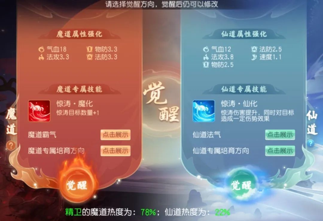 接下来我们来看宠物觉醒,探讨精卫更适合仙道还是魔道。刚才提到宠物的两个培养方向:暴力和血耐,它们的觉醒方向也有所不同。