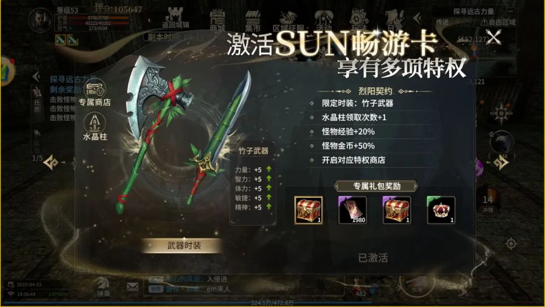 - 增购198元三档:获20%经验加成+50%金币加成+竹子武器特权