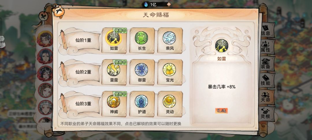 - 仙阶1重:如雷>长生>乘风。段古今依赖天命打伤害,如雷的暴击率性价比高;若暴击率溢出,可选择加生命的长生;在剑修前期秒人时代,可选择加速度的乘风先手秒对面输出,但后期全员坦度提高后,乘风的重要性降低(特殊玩法除外)。
