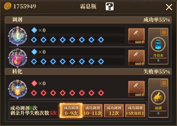 其中“转化”部分里,每有1次步骤亮起,则代表1次升华失败,升华失败超过一定次数,则游戏直接失败,无法获得任何奖励。