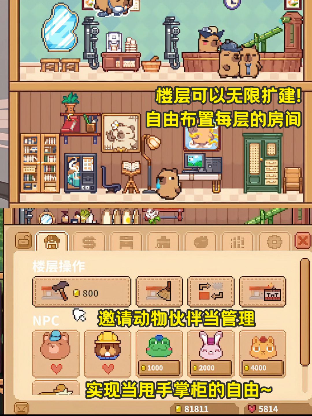 🤔不同的娱乐项目能吸引各式各样的卡皮巴拉入住哦,尽可能的满足它们的需求❗️同时也能解锁更丰富多样的家具和设备~