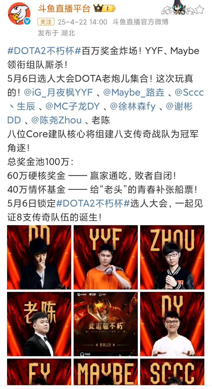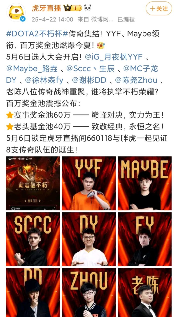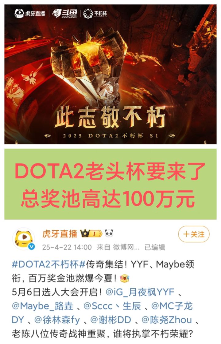 4/22号,虎牙和斗鱼同时发文,宣布将举办《DOTA2》不朽杯,俗称“老头杯”❗❗❗