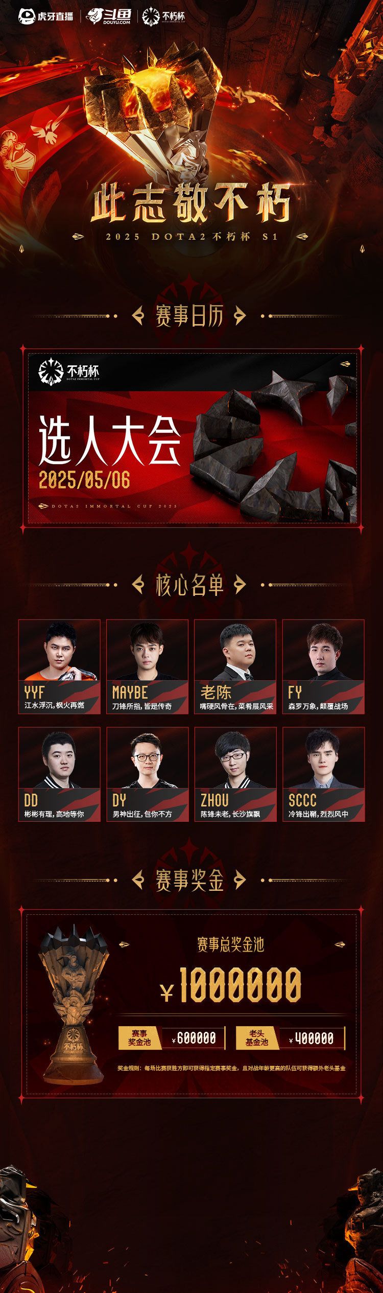 本次DOTA2赛事将由虎牙、斗鱼共同举办,赛事总奖池高达百万,5月6日YYF和Maybe等8位队长将开始为各自的战队选人![[表情_斜眼笑]](https://img-tc.tapimg.com/market/images/d1b1dcc88719f6c9a639728cde152c4b.png)