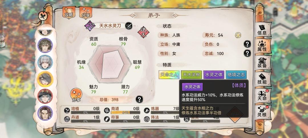 建议大家优先挑选具有高潜力、高根骨的弟子,根骨90以上可以通过后山池子获得特殊紫色体质。水灵根是修炼水系功法的基础,能让天水刀弟子有更快的水系功法修炼速度和更高的功法威力提升。在天赋特质方面,“水灵之体”与天水刀完美适配,可提升水系技能效果。