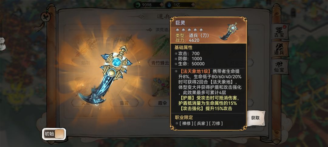 1. 巨灵:可以通过活动宝箱和地宫摇色子免费获得,完美适配刀修弟子属性,能够大幅提高天水刀的输出和生存能力。