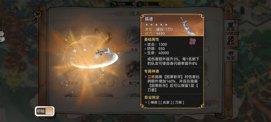 3. 孤途:卫寒的天命赠礼伴生道兵,天命达到红一后氪328可获得。虽获取有一定条件,但与卫寒契合度高,能提升其战斗能力。不建议给普通天水刀装备。