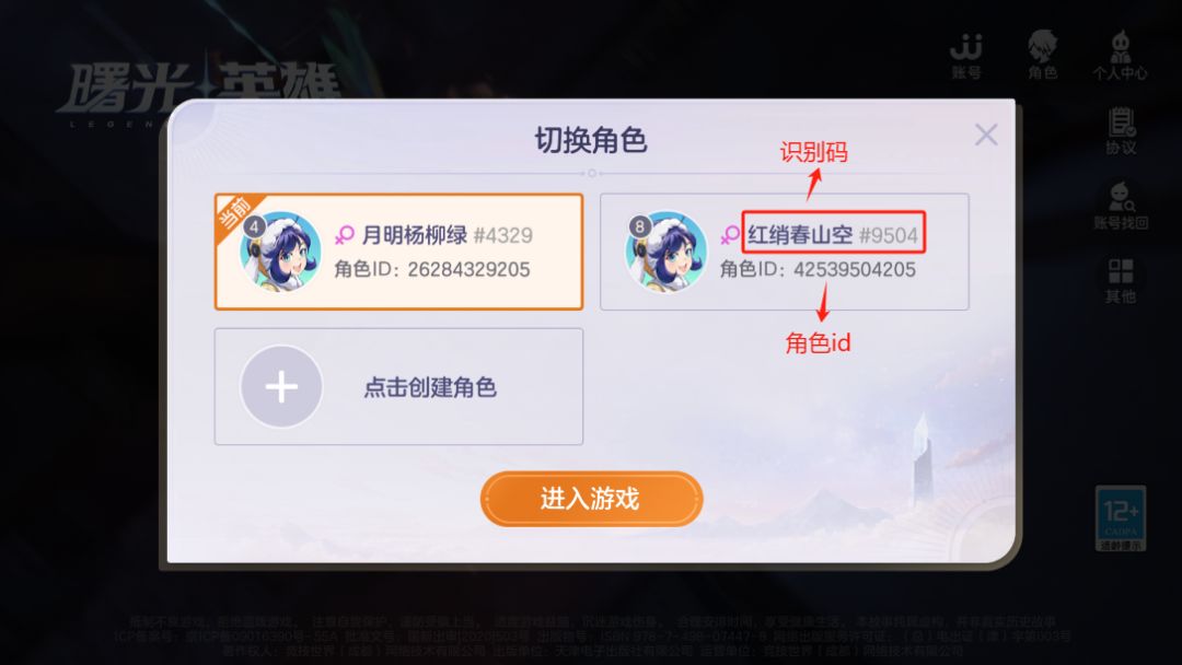 识别码和角色id在游戏内外均可查询: