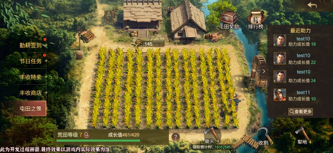 三国时期,连年的战火焚尽了良田,荒土地亟待新生。本次『屯田之策』活动中,主公们将在这片土地上通过不懈的开垦、好友的协助,完成一次又一次的丰收,造就千仓万库粮草,重现九州粮仓指日可待!