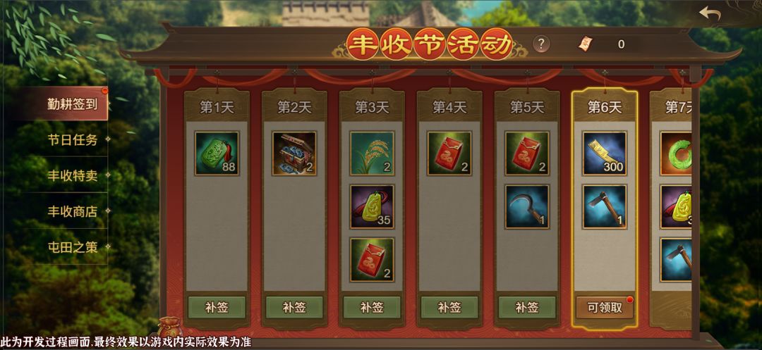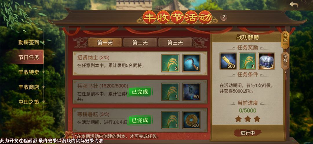 本次『丰收节』活动分为四个部分:屯田之策、勤耕签到、节日任务、丰收商店