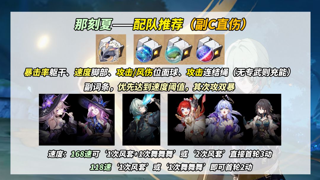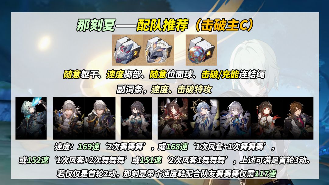 配速:169速‘2次舞舞舞’,或168速‘1次风套+1次舞舞舞’,或152速‘1次风套+2次舞舞舞’,或151速‘2次风套1舞舞舞’,上述可满足首轮3动。若仅仅是首轮2动,那刻夏带个速度鞋,配合队友舞舞舞仅需117速