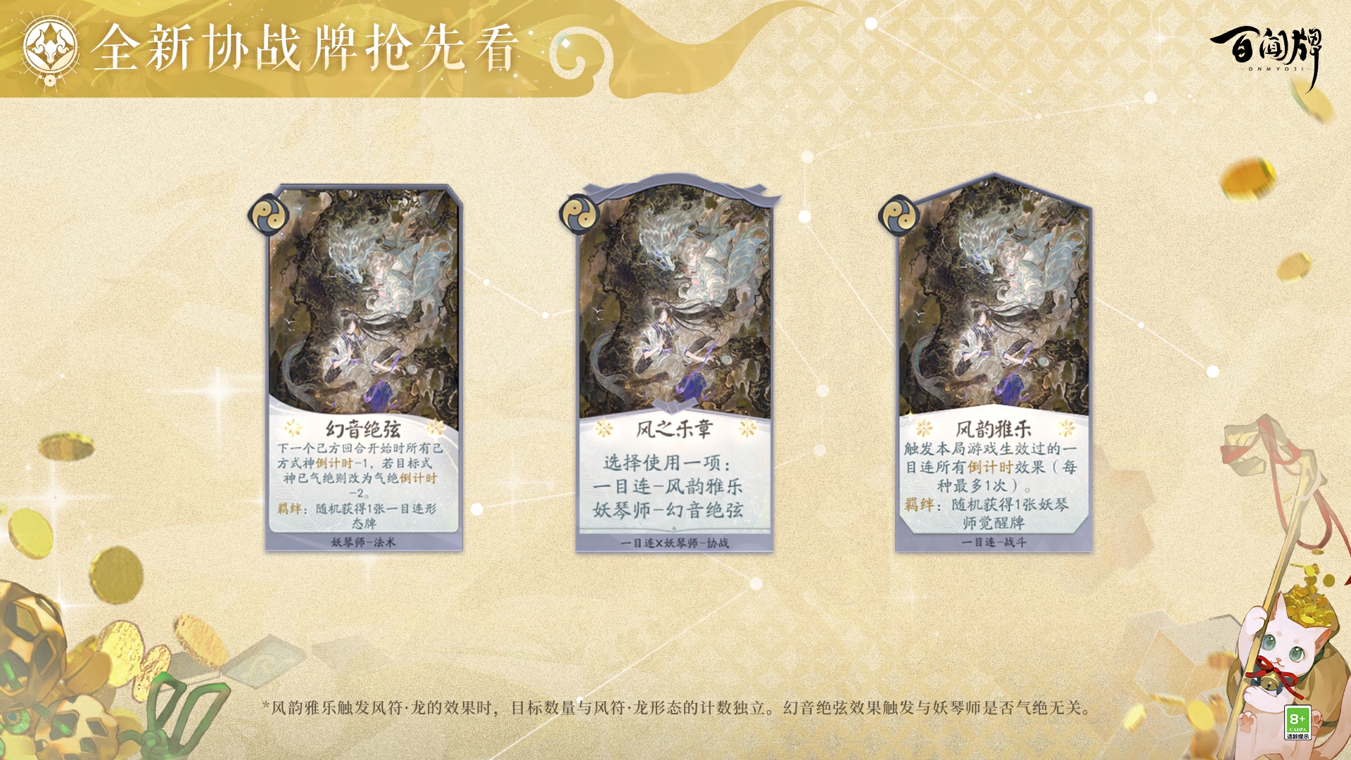 · 累计获取「协战积分」可在活动页面获得妖琴师/一目连SSR协战牌「风之乐章」、妖琴师以及一目连的SR卡牌以及其14日体验卡、星缘百策秘闻卷等奖励。
