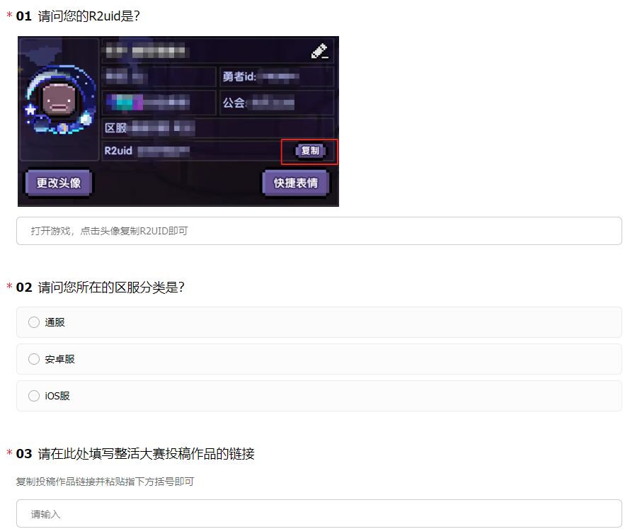 2、复制创意征集帖链接,在本帖的问卷内填入并输入自己游戏的R2ID+区服,即视为参与成功啦!