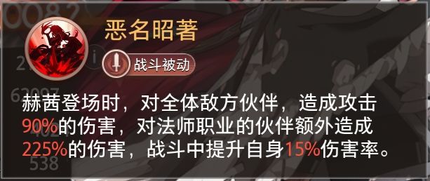 赫茜登场时,对全体敌方伙伴,造成攻击90%的伤害,对法师职业的伙伴额外造成225%的伤害,战斗中提升自身15%伤害率。