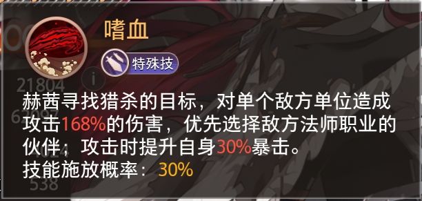 赫茜寻找猎杀的目标,对单个敌方单位造成攻击168%的伤害,优先选择敌方法师职业的伙伴;攻击时提升自身30%暴击。技能施放概率:30%