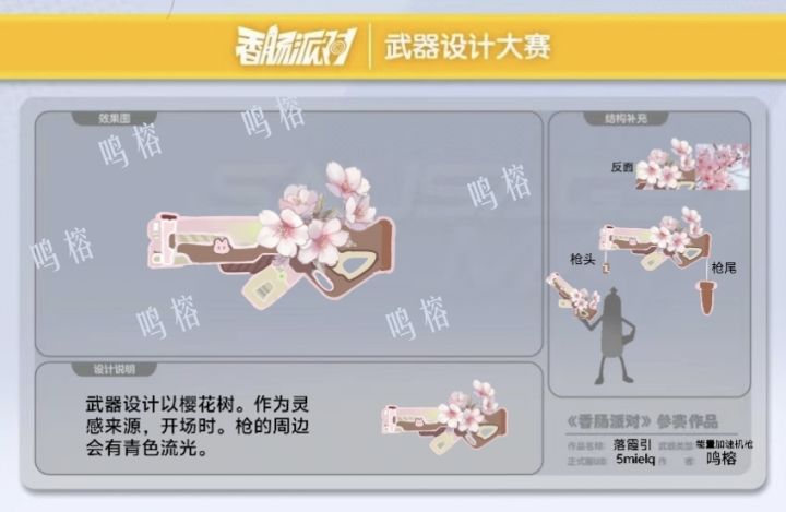 设计灵感:把樱花元素融入枪械设计,让刚硬的武器有了柔美诗意的一面。枪身点缀的樱花,如同春日里绽放的希望,既寓意着在激烈对战中也能留存一丝美好,也希望玩家在游戏时,能感受到如同置身樱花林般的浪漫与惬意,在紧张刺激的战斗之余,多一份独特的视觉享受和情感慰藉。