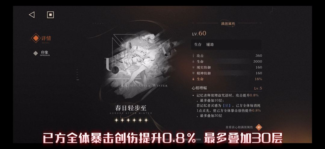 若记忆者灵感为【星】,已方全体每消耗1点灵光,使已方全体暴击创伤提升0.8%,最多叠加30层