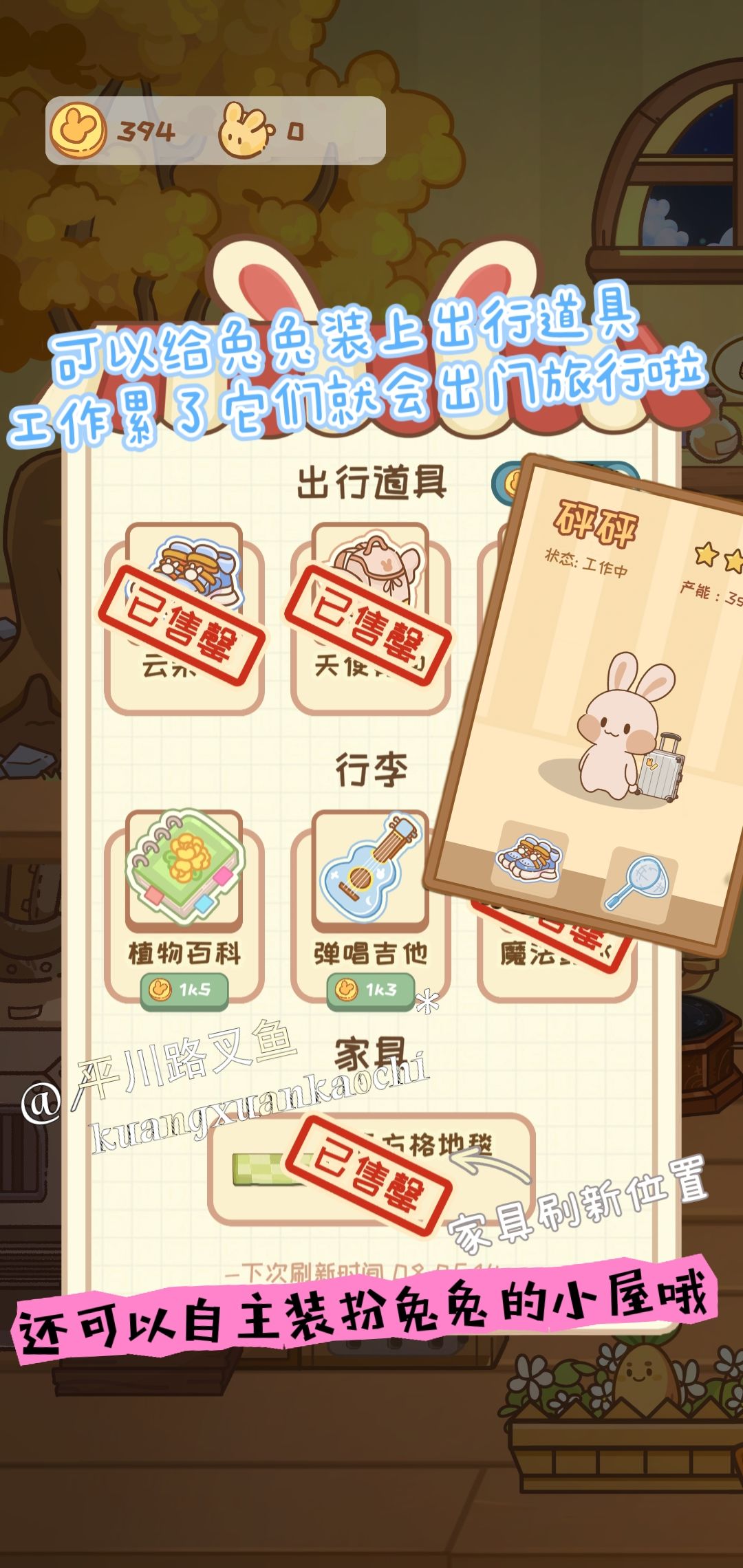 🍬游戏内容:可以孵化小兔兔。兔兔可以打工赚钱,也可以出门旅行,旅行的话会带回来很多纪念品和明信片哦。此外,还可以装饰兔兔们的家。
