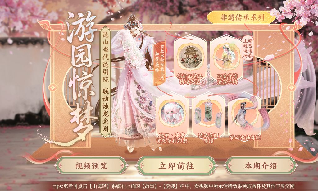 “袅晴丝吹来闲庭院,摇漾春如线。”各位旅者好呀,春日生春情,在百花盛开、姹紫嫣红之时,本咪也为大家带来了一系列极具春天气息的时装、外显——当当当,它就是我们妄想山海与昆山当代昆剧院联动,推出的首款非遗传承系列——《牡丹亭》联动烛龙企划【游园惊梦】~