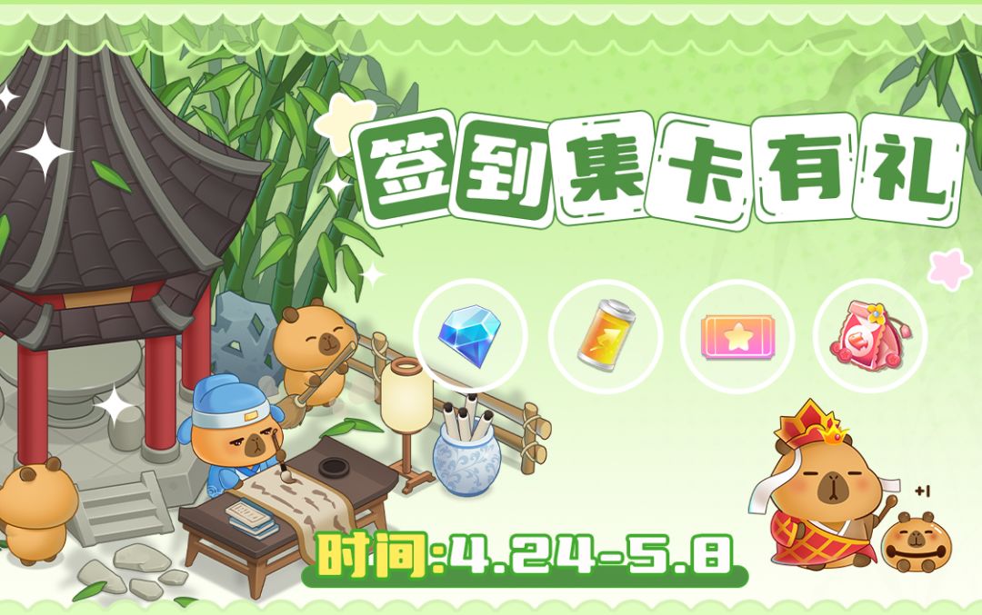 关注游戏+帖子下方留言区分享你认为最喜欢的卡皮巴拉萌图和其他ip萌图,并留言以后联名活动的期待+游戏编号,即算参与成功!
