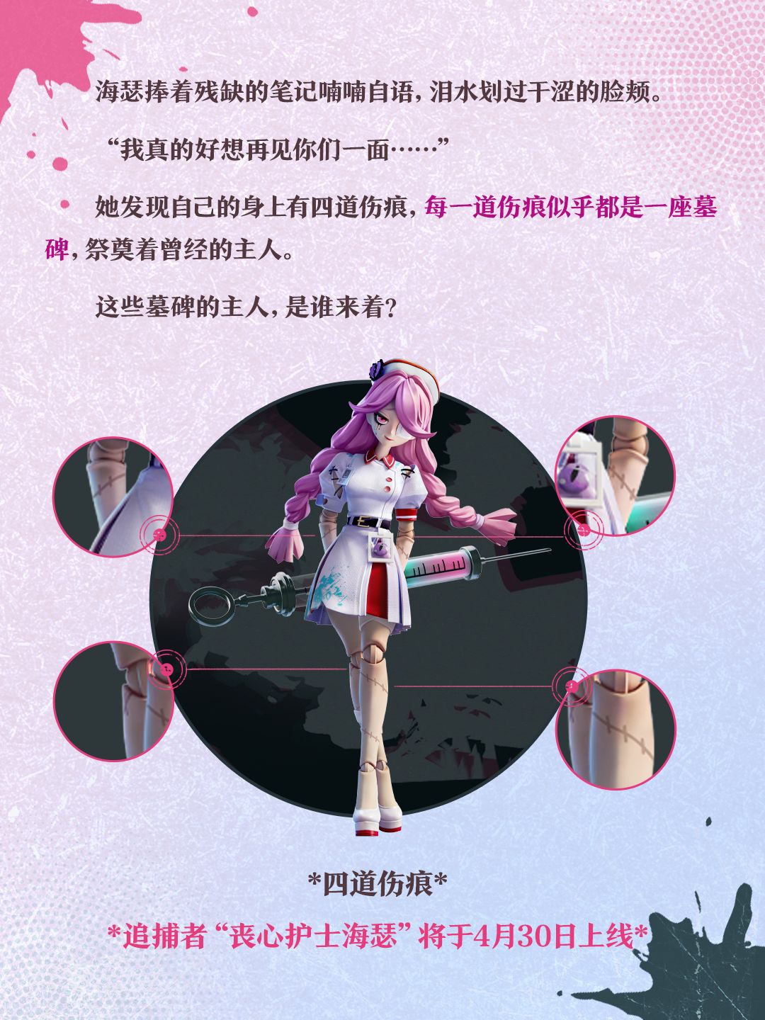 ■ 4月30日,追捕者“丧心护士海瑟”、逃生者“水鬼·伊文”即将加入游戏。使用酷乐币即可兑换永久游玩权限。