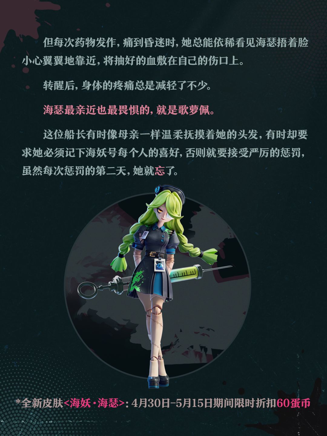 ■ “丧心护士海瑟”全新皮肤<海妖·海瑟>上线,4月30日-5月15日期间限时折扣60蛋币。