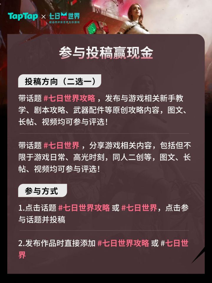「游戏攻略」:带话题#七日世界攻略 发布游戏新手攻略、武器详解、生存技巧等内容