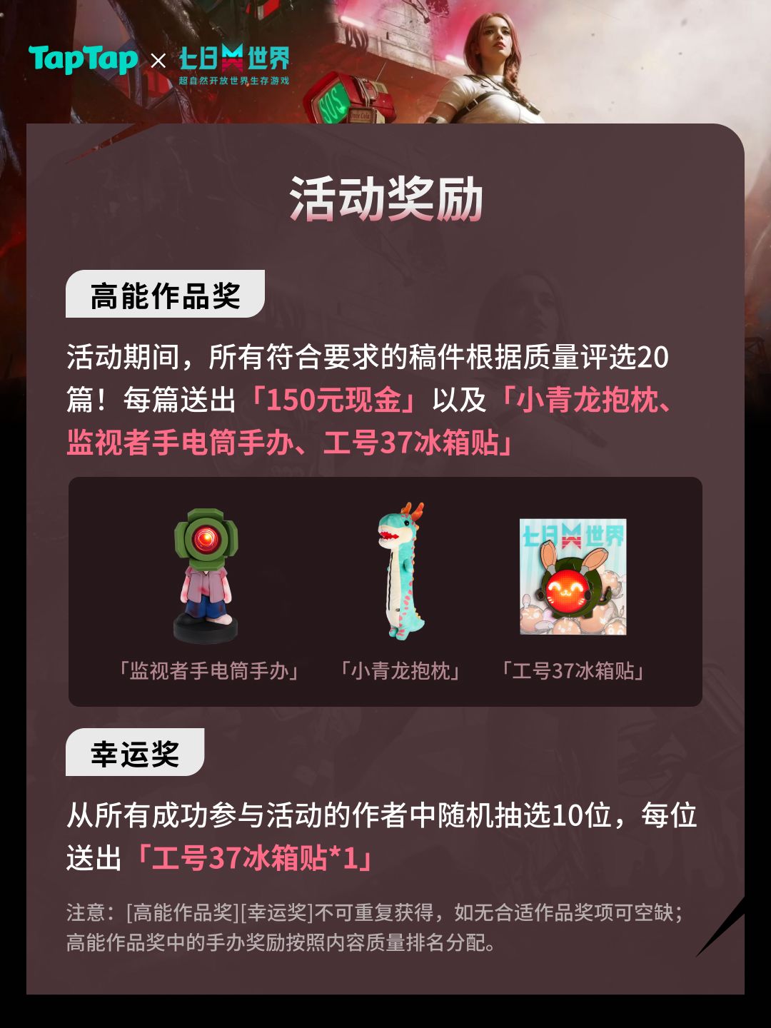 「高能作品奖」活动期间,所有符合要求的稿件根据质量评选20篇,每篇送出【150元现金】以及第1-3名获得【小青龙抱枕+工号37冰箱贴】、第4-10名获得【监视者手电筒手办+工号37冰箱贴】、第11-20名获得【工号37冰箱贴】