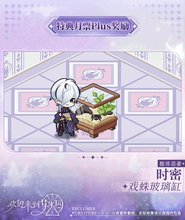 -核心奖励内容:解锁乐园月票进阶奖励、时密[险诈忍者]心绪时光·缠绕之礼、时密[险诈忍者]专属互动家具「戏蛛玻璃缸」