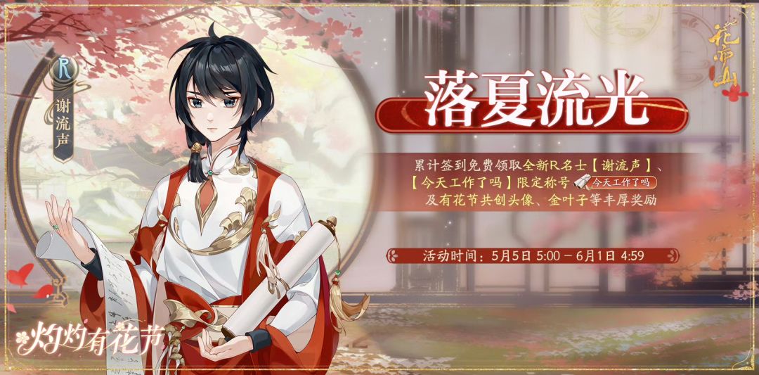 *活动说明:每日签到领好礼,活动期间累计签到即可免费解锁全新R名士【谢流声】、有花节共创头像、限定称号【今天工作了吗】、金叶子等丰厚奖励。