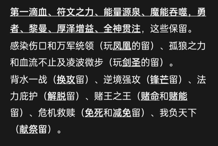 这个位置我会把我的实时阵容思路分享出来(进阶,新手可以先不看,以后回来看),上边那个只是一个模板:现在我发现炽天使带个鬼影重重(隐身)很爽,受到致命伤先隐身,然后配合危机救赎血量到零无敌八秒,无缝衔接,大大提升炽天使存活来复活队友和提供无敌!前期人手一套危机,但危机的缺点是无敌期间无法回血,无法受伤回能,因为血量维持在零就没有变化,就没有了受伤回能。后期等孔位够了后危机会换黎盾加勇者,一样肉还没有危机的缺点!!!