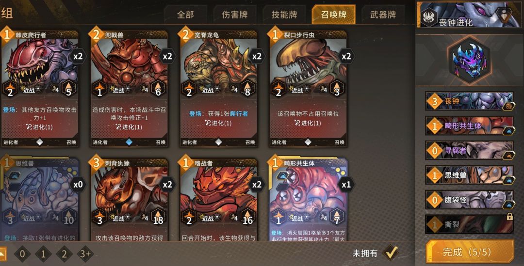卡组思路:进化召唤非常讲究召唤的位置,核心是畸形吃三个怪以提升基因点到5+,再下双生行者、浮翼领航者实现群体多段围殴。高难本开局首招减费记得先放援护卡保命,然后三角布置△寻腐和腹带等,中间放畸形吃掉,有费可以继续循环养大畸形,开局没抽到畸形的也可以下思维兽拉出来。召唤位吃紧的角色,前期图里拿裂口步行虫过渡,后期直接孵化场。