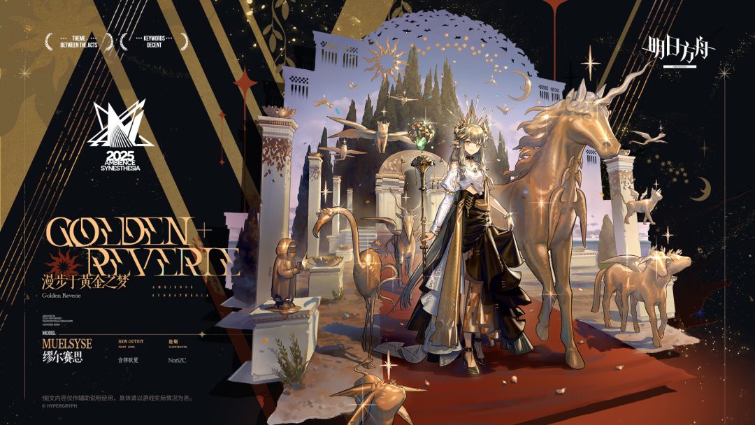 服装和饰品的搭配加上场景的构建让缪尔赛斯更像是开幕主持人,而且这款皮肤甚至可以说完全没有音律联觉特色,适用于各种庆典场景