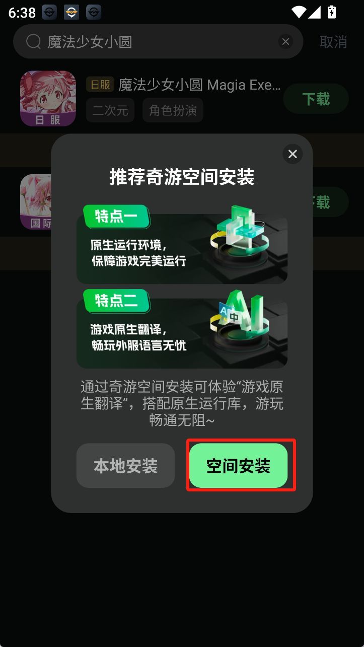 1、 奇游内下载游戏选择空间安装 一定要选择空间安装不如无法使用翻译(日服国际服都可以)