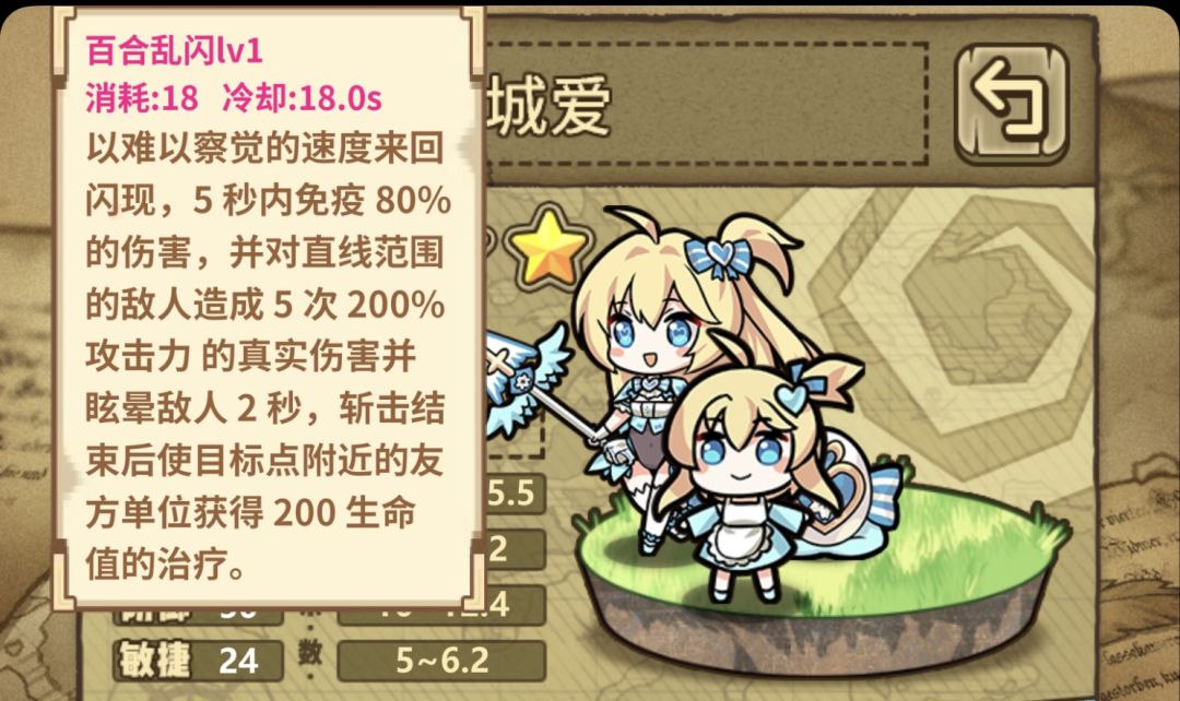 技能描述:5秒内90%/90%/90%/的免伤+50%/60%/70%的范围回血和净化+40%/50%/60%攻击力的范围伤害,每秒召唤2/2/3个猫猫史莱姆,每只100%/150%/150%攻击力的爆炸伤害