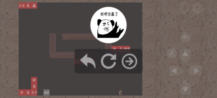 破坏“蛇是A动”,按图一所示,组成“蛇是王子”,如此【蛇】变成【王子】,即可触碰【公主】过关
