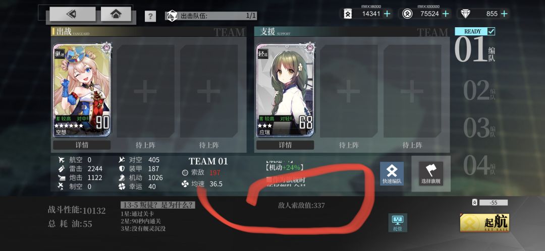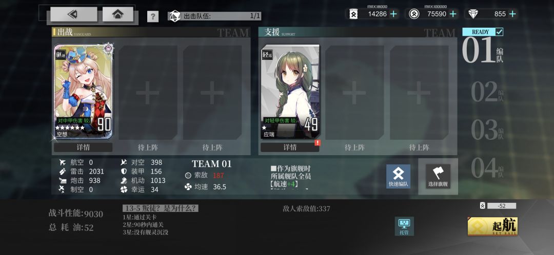 遂趁着这次的福利姬活动,我来分享一波大多数老玩家都懂的低油耗13-5捞船法。首先,13-5的1+1常规阵容有两套——胡德(纯白女皇)与女灶神(火焰女神)、空想(幻想曲)+应瑞(玉瑞)